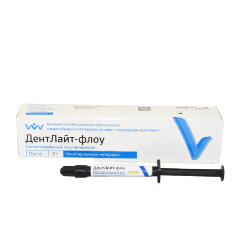 Благодаря высокому показателю текучести композита Дентлайт Флоу он полностью заполняет все предоставленное ему пространство. Имеет фотополимеризационные свойства, отличается рентгеноконтрастностью.