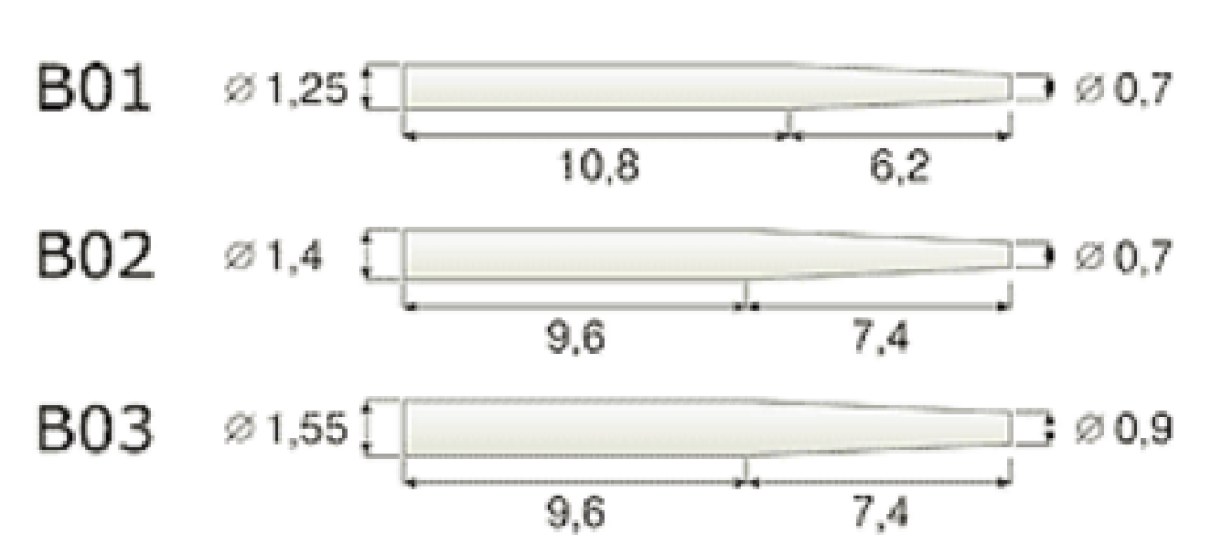 В конструкции стекловолоконных штифтов IKS-В03-V не предусмотрены опорные плечи, поэтому они не используются в качестве основы под мосты и другие объемные конструкции. Надежность обеспечивается повышенной прочностью и модулем упругости.